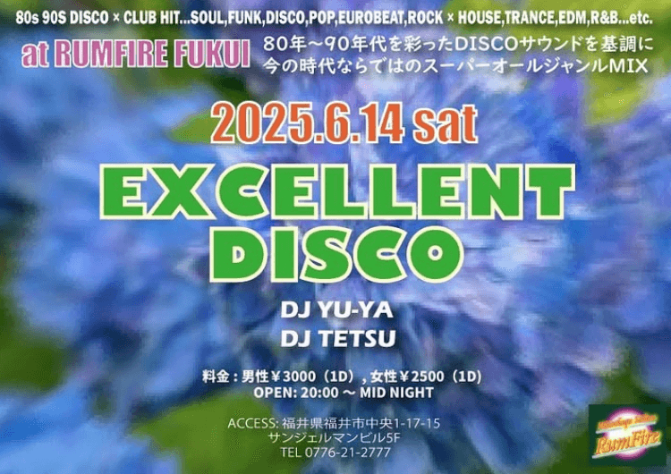 EXCELLENT DISCO PARTY INFO Fukui Club Night Party EXCELLENT DISCO DAY:2025.06.14 Sat. OPEN:20:00~ MAN:\3,000-/1D WOMAN:\2,500-/1D VENUE:RUMFIRE ■DJ YU-YA TETSU
