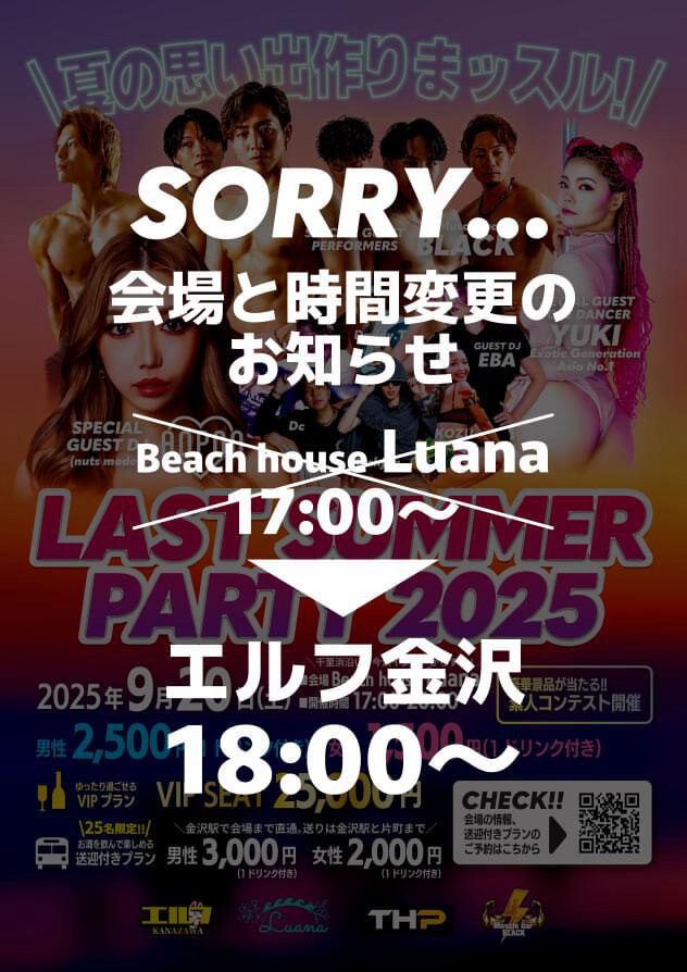 LAST SUMMER PARTY 2025 PARTY INFO Kanazawa Bar Night Party LAST SUMMER PARTY 2025 DAY:2025.09.20 Sat. OPEN:18:00~ 男性:2,500JPY(W1D) 女性:1,500JPY(W1D) VENUE:エルフ金沢