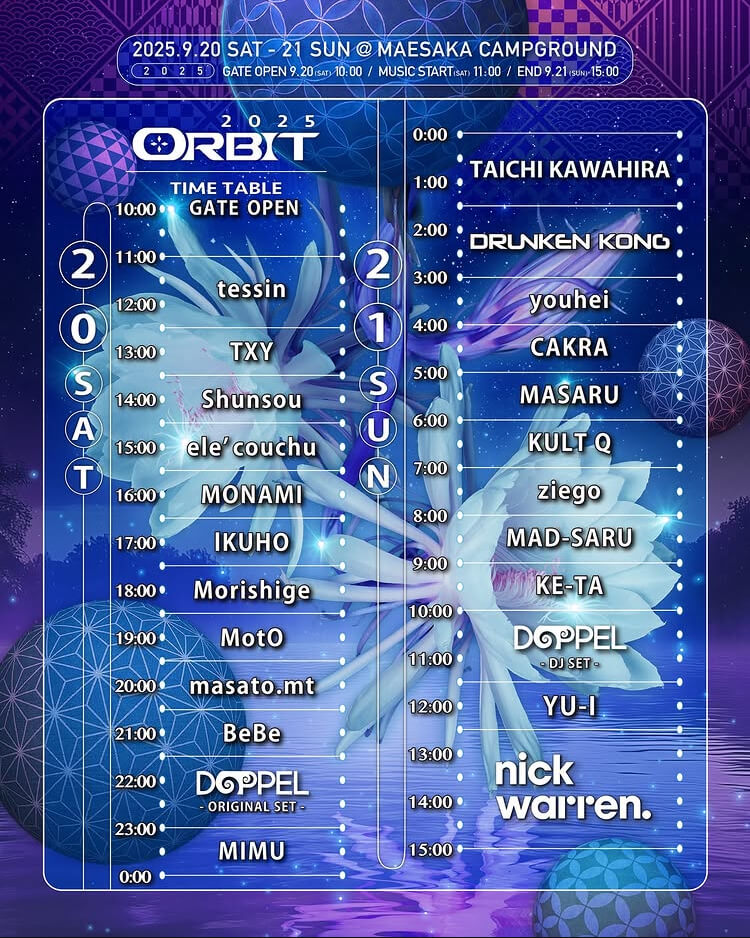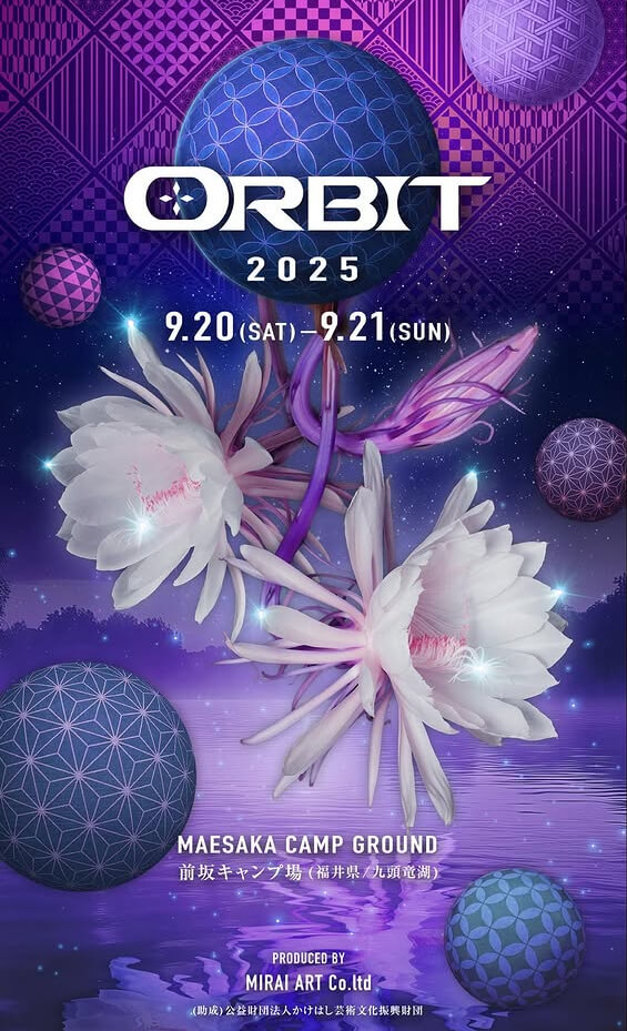 ORBIT PARTY INFO Fukui Fes Bar Food Art Night Party Day Party All Night ORBIT DAY:2025.09.20 Sat. GATE OPEN:10:00 MUSIC START:12:00 VENUE:前坂キャンプ場(九頭竜湖北) INFO:ORBIT