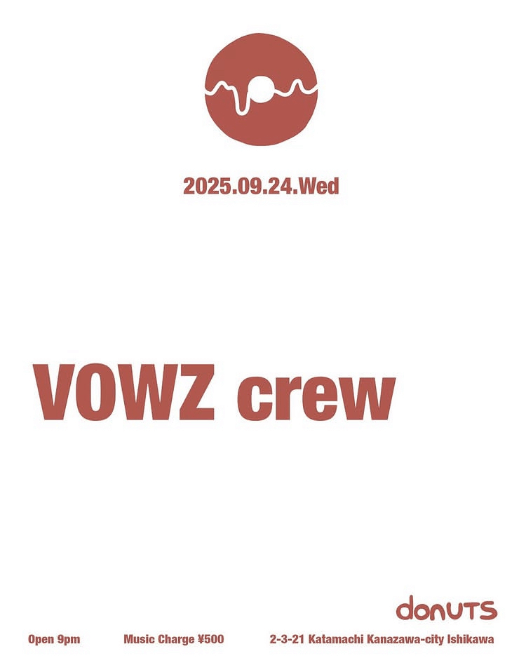 09.24/music bar donuts PARTY INFO Kanazawa Bar Night Party 09.24/music bar donuts DAY:2025.09.24 Wed. OPEN:21:00 MUSIC CHARGE:500JPY VENUE:music bar donuts ■DJ VOWZ crew