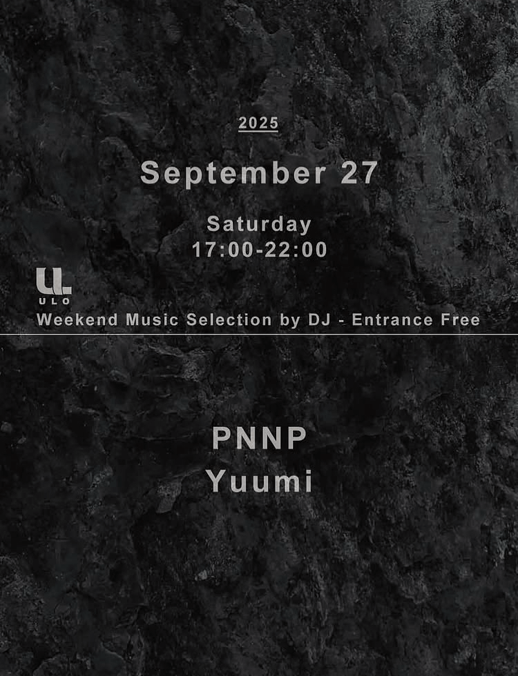 Weekend Music Selection PARTY INFO Fukui Night Party Weekend Music Selection DAY:2025.09.27 Sat. OPEN:17:00~22:00 ENTRANCE:FREE VENUE:ULO ■DJ PNNP Yuumi