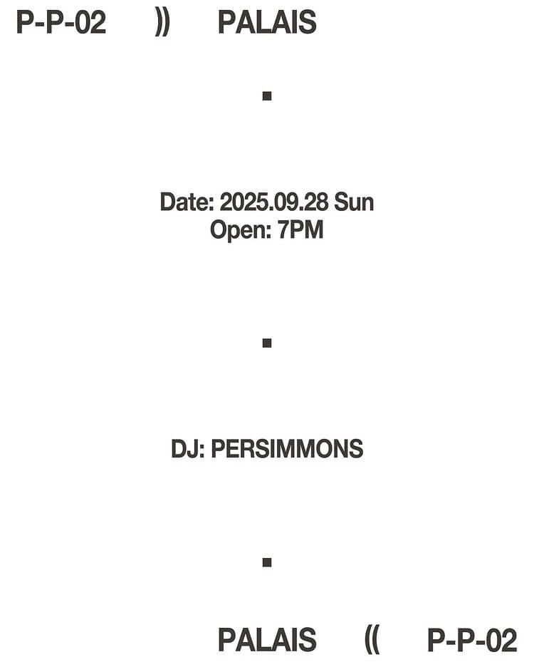 PUBLIC PLACTICE-02 PARTY INFO Kanazawa Club Night Party PUBLIC PLACTICE-02 DAY:2025.09.28 Sun. OPEN:19:00 DOOR:FREE VENUE:PALAIS ◼︎DJ PERSIMMONS