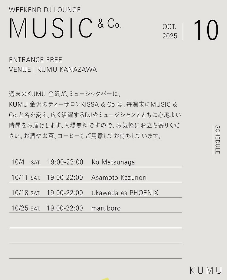 MUSIC & Co. PARTY INFO Kanazawa Bar Night Party MUSIC & Co. DAY:2025.10.18 Sat. OPEN:19:00~22:00 ENTRANCE:FREE VENUE:KUMU ■DJ t.kawada as PHOENIX