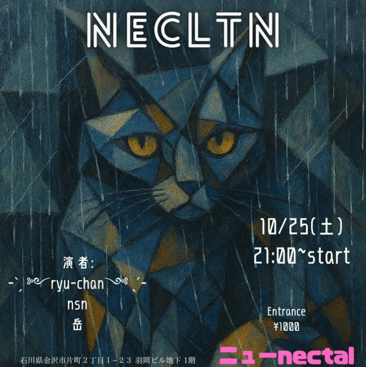 NECLTN PARTY INFO Kanazawa Bar Night Party NECLTN DAY:2025.10.25 Sat. START:21:00 ENTRANCE:1,000JPY VENUE:ニューnectal ■DJ ryu-chan nsn 岳