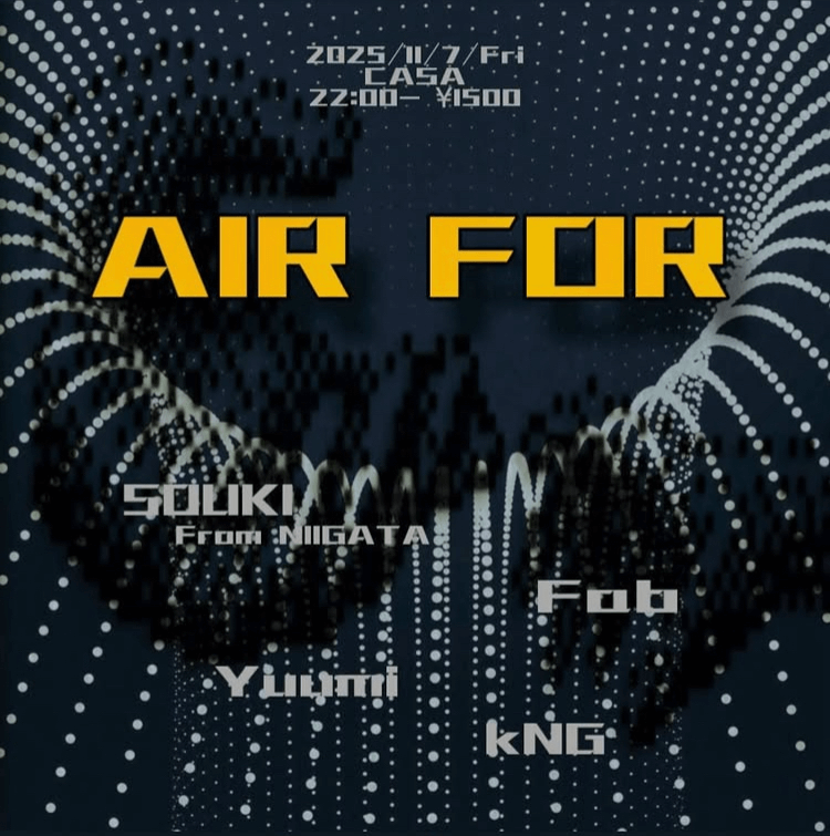 AIR FOR PARTY INFO Fukui Club Night Party AIR FOR DAY:2025.11.07 Fri. OPEN:22:00 DOOR:1,500JPY VENUE:Casa ■DJ SOUKI From NIIGATA Fab Yuumi kNG