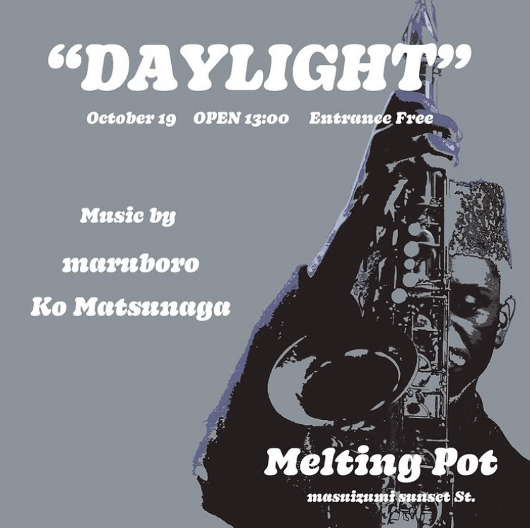 DAYLIGHT PARTY INFO Kanazawa Bar Night Party DAYLIGHT DAY:2025.10.19 Sun. OPEN:13:00 ENTRANCE:FREE VENUE:Meltingpot ■MUSIC maruboro Ko Matsunaga