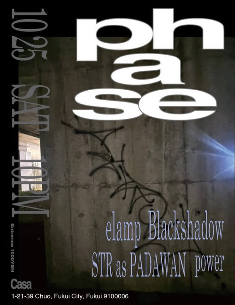 phase PARTY INFO Fukui Club Night Party phase DAY:202510.25 Sat. OPEN:22:00 ENTRANCE:1,000JPY VENUE:Casa ■DJ elamp Blackshadow STR as PADAWAN power