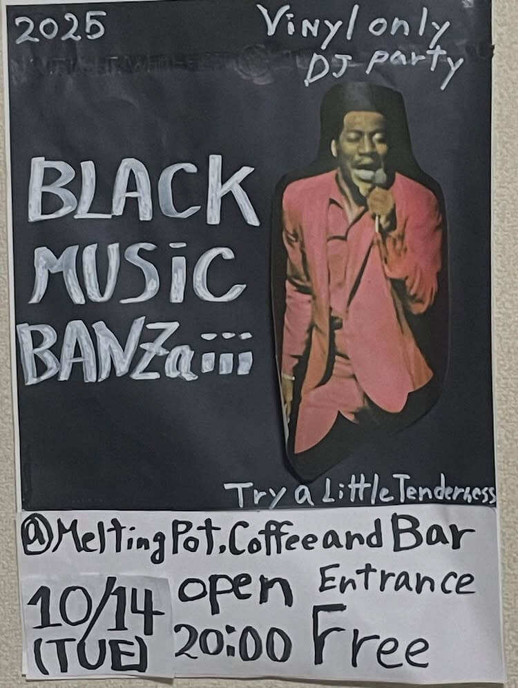 BLACK MUSiC BANZaiii PARTY INFO Kanazawa Bar Night Party BLACK MUSiC BANZaiii DAY:2025.10.14 Tue. OPEN:20:00 ENTRANCE:FREE VENUE:Meltingpot