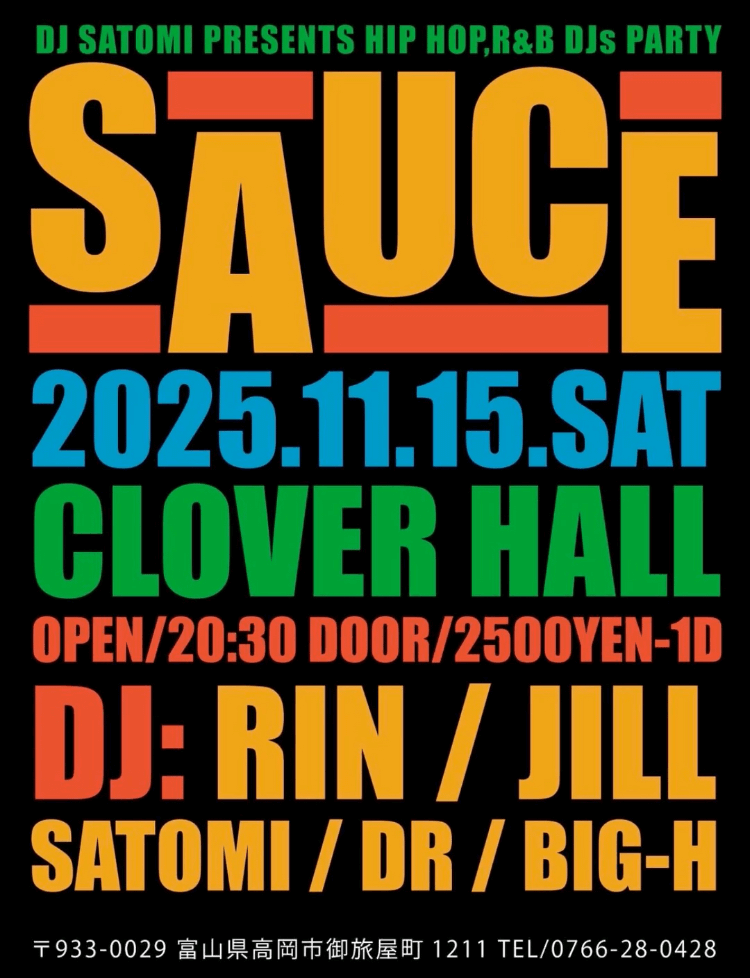 SAUSE PARTY INFO Toyama Night Party SAUSE DAY:2025.11.15 Sat. OPEN:20:30 DOOR:2,500JPY -1D VENUE:CLOVER HALL ■DJ RIN JILL SATOMI DR BIG-H