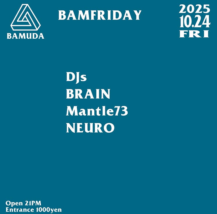 BAMFRIDAY PARTY INFO Kanazawa Club Night Party BAMFRIDAY DAY:2025.10.24 Fri. OPEN:21:00 ENTRANCE:1,000JPY VENUE:BAMUDA ■DJ BRAIN Mantle73 NEURO