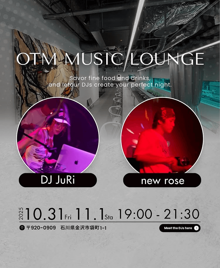 OTM MUSIC LOUNGE PARTY INFO Kanazawa Bar Night Party OTM MUSIC LOUNGE DAY:2025.10.31 Fri. OPEN:19:00~21:30 VENUE:OTM ■DJ JuRi