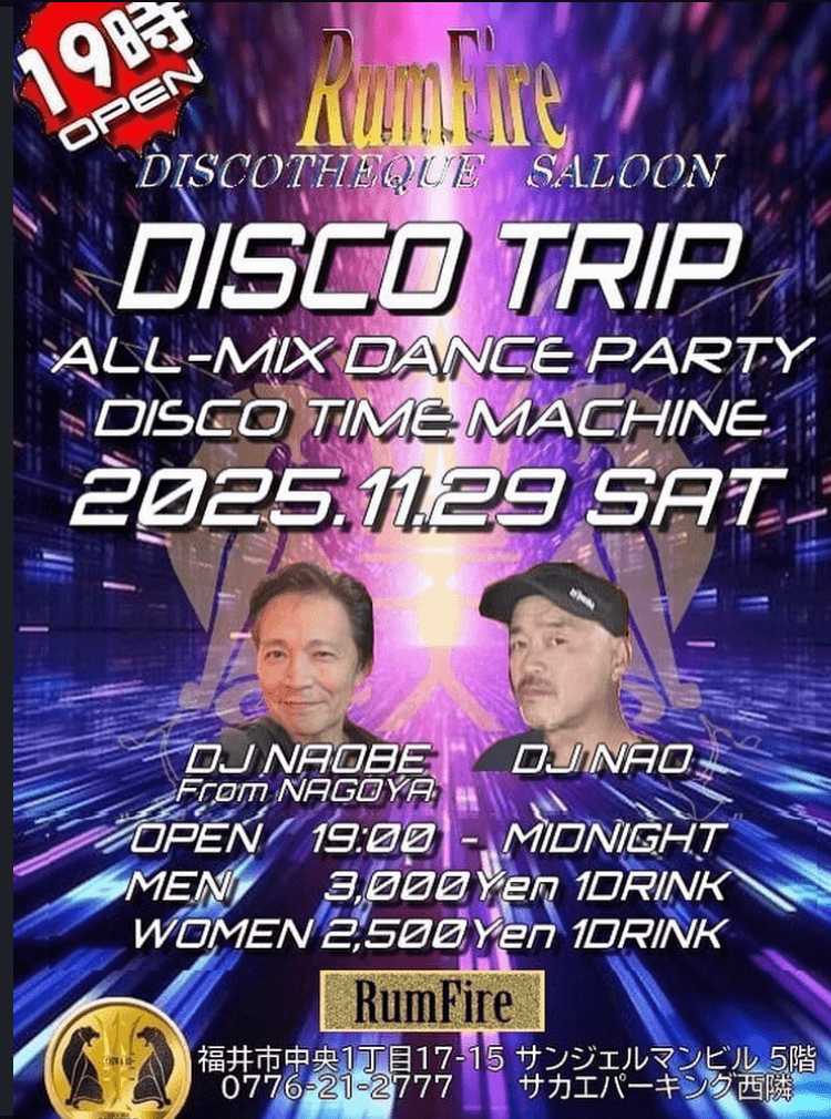DISCO TRIP PARTY INFO Fukui Club Night Party DISCO TRIP DAY:2025.11.29 Sat. OPEN:19:00 MEN:3,000JPY 1D WOMEN:2,500JPY 1D VENUE:RUMFIRE DJ NAOBE from NAGOYA DJ NAO