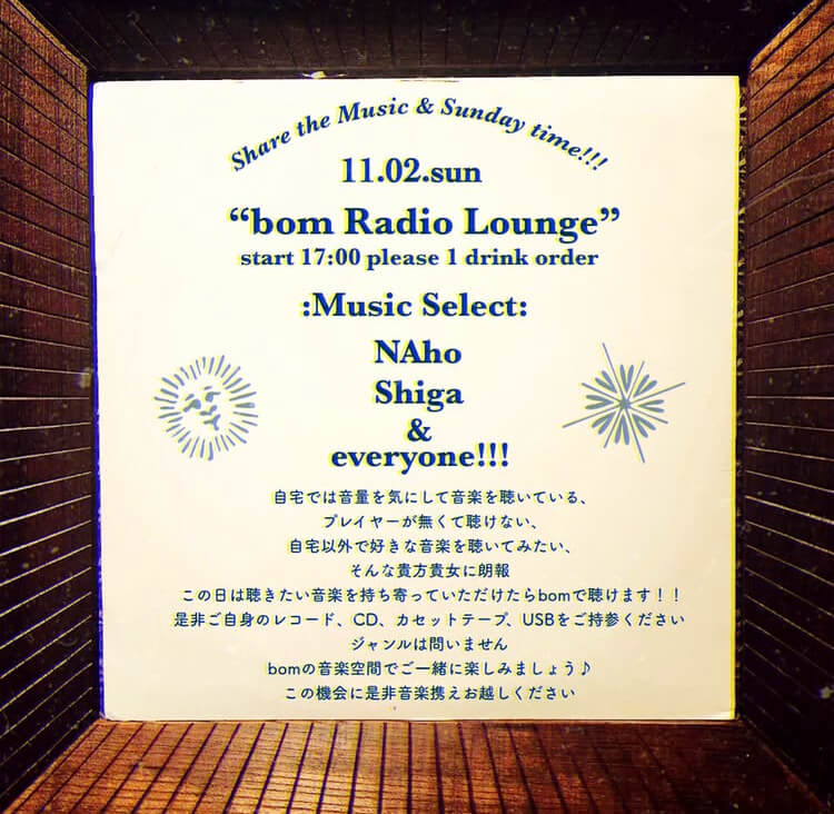 bom Raddio Lounge PARTY INFO Toyama Bar Night Party bom Raddio Lounge DAY:2025.11.02 Sun. START:17:00 FEE:1drink order VENUE:bom ◾️MUSIC NAho Shiga & every one!!!
