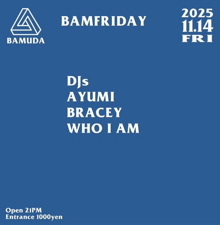 BAMFRIDAY PARTY INFO Kanazawa Club Bar Night Party BAMFRIDAY DAY:2025.11.14 Fri. OPEN:21:00 ENTRANCE:1,000JPY VENUE:BAMUDA ■DJ AYUMI BRACEY WHO I AM