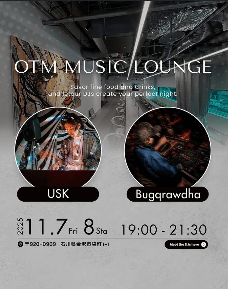 OTM MUSIC LOUNGE PARTY INFO Kanazawa Bar Night Party OTM MUSIC LOUNGE DAY:2025.11.08 Sat. OPEN:19:00~21:30 VENUE:OTM ■DJ Bugqrawdha