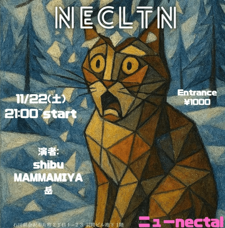 NECLTN PARTY INFO Kanazawa Bar Night Party NECLTN DAY:2025.11.22 Sat. START:21:00 ENTRANCE:1,000JPY VENUE:ニューNECTAL ■演者 shibu MANMAMIYA 岳