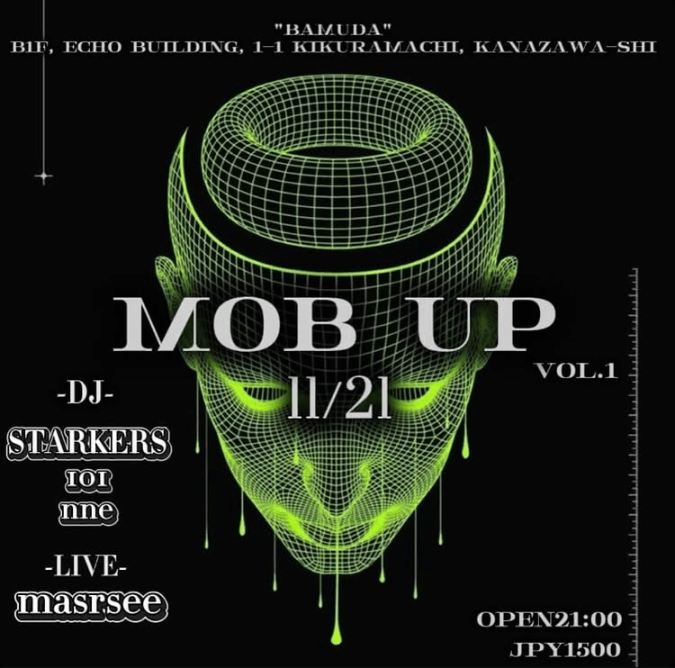 MOB UP VOL.1 PARTY INFO Kanazawa Club Night Party MOB UP VOL.1 DAY:2025.11.21 Fri. OPEN:21:00 DOOR:1,500JPY VENUE:BAMUDA ■DJ STARKERS IOI nne ■LIVE masrsee