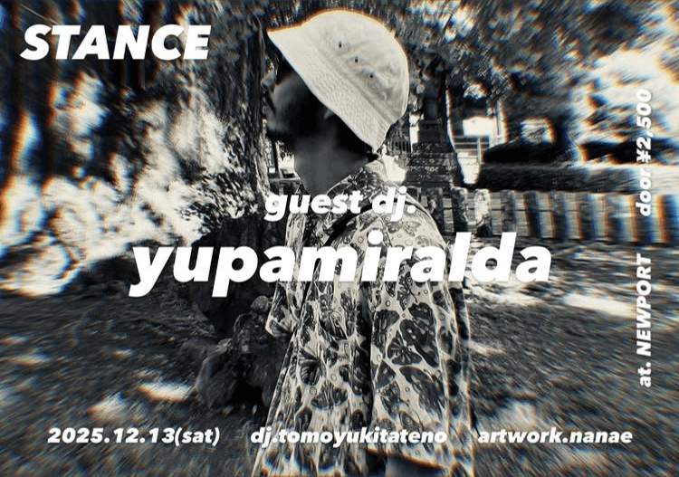 STANCE PARTY INFO Toyama Bar Night Party STANCE DAY:2025.12.13 Sat. DOOR:2,500JPY VENUE:NEW PORT INFO:STANCE ■GUEST DJ yupamiralda