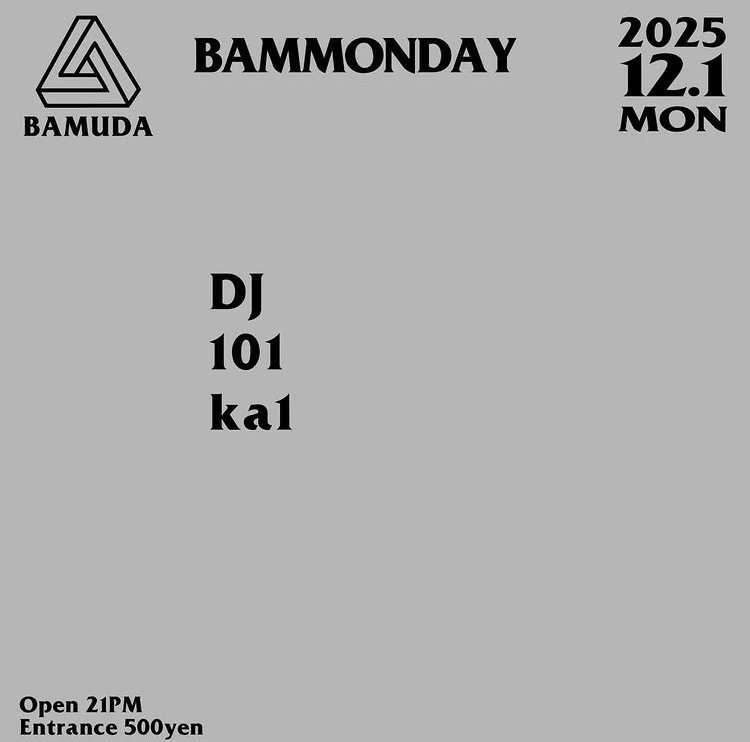 BAMMONDAY PARTY INFO Kanazawa Club Bar Night Party BAMMONDAY DAY:2025.12.01 Mon. OPEN:21:00 ENTRANCE:500JPY VENUE:BAMUDA ■DJ 101 ka1
