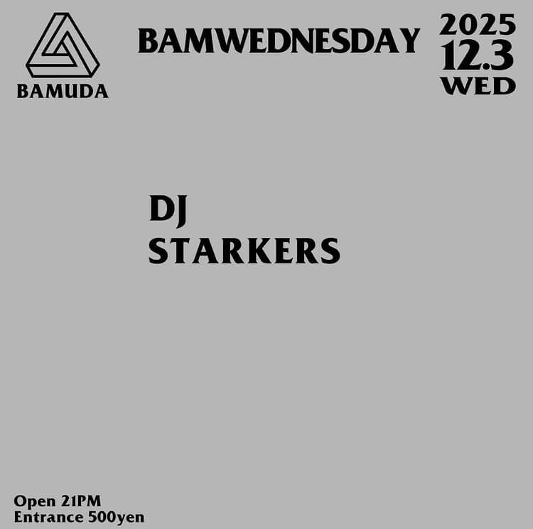 BAMWEDNESDAY PARTY INFO Kanazawa Club Bar Night Party BAMWEDNESDAY DAY:2025.12.03 Wed. OPEN:21:00 ENTRANCE:500JPY VENUE:BAMUDA ◼️DJ STARKERS