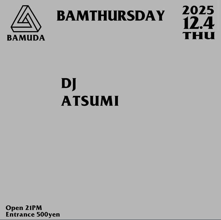 BAMTHURSDAY PARTY INFO Kanazawa Club Bar Night Party BAMTHURSDAY DAY:2025.12.04 Thu. OPEN:21:00 ENTRANCE:500JPY VENUE:BAMUDA ◼️DJ ATSUMI