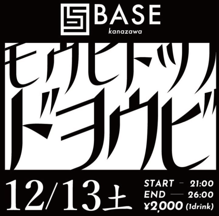モウヒトツノドヨウビ PARTY INFO Kanazawa Club Bar Night Party モウヒトツノドヨウビ DAY:2025.12.13 Sat. START:21:00 END:26:00 DOOR:2,000JPY(1drink) VENUE:BASE