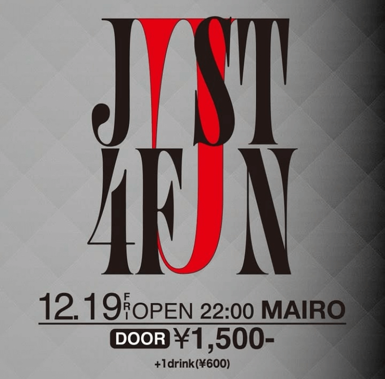 JUST 4 FUN PARTY INFO Toyama Club Night Party JUST 4 FUN DAY:2025.12.19 Fri. OPEN:22:00 DOOR:1,500JPY ※入場時別途ドリンク代600JPY必要です。 VENUE:MAIRO