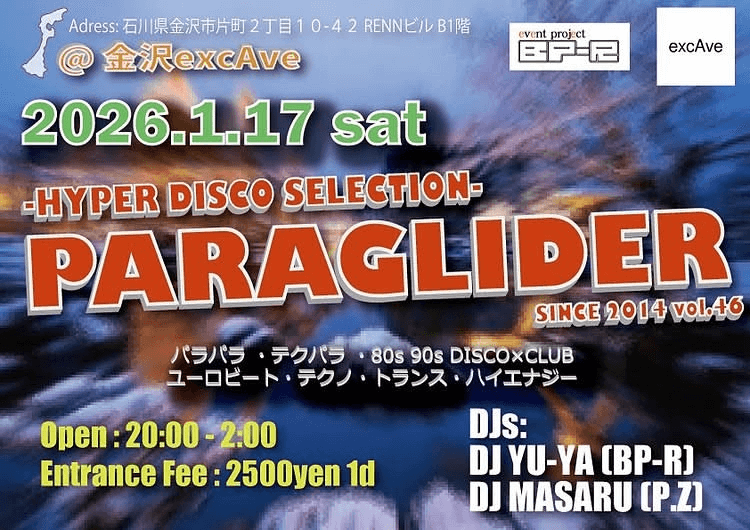 PARAGLIDER PARTY INFO Kanazawa Club Night Party PARAGLIDER DAY:2026.01.17 Sat. OPEN:20:00~02:00 ENTRANCE:2,500JPY 1D VENUE:excAve ■DJ YU-YA(BP-R) MASARU(P.Z)