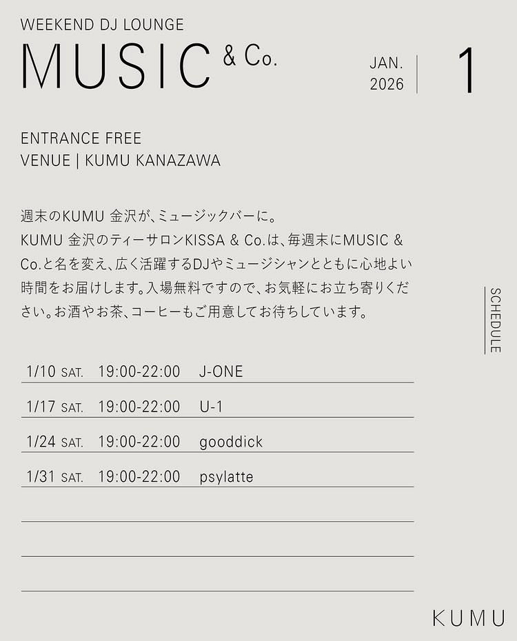MUSIC & Co. PARTY INFO Kanazawa Bar Night Party MUSIC & Co. DAY:2026.01.17 Sat. OPEN:19:00~22:00 ENTRANCE:FREE VENUE:KUMU ■DJ U-1