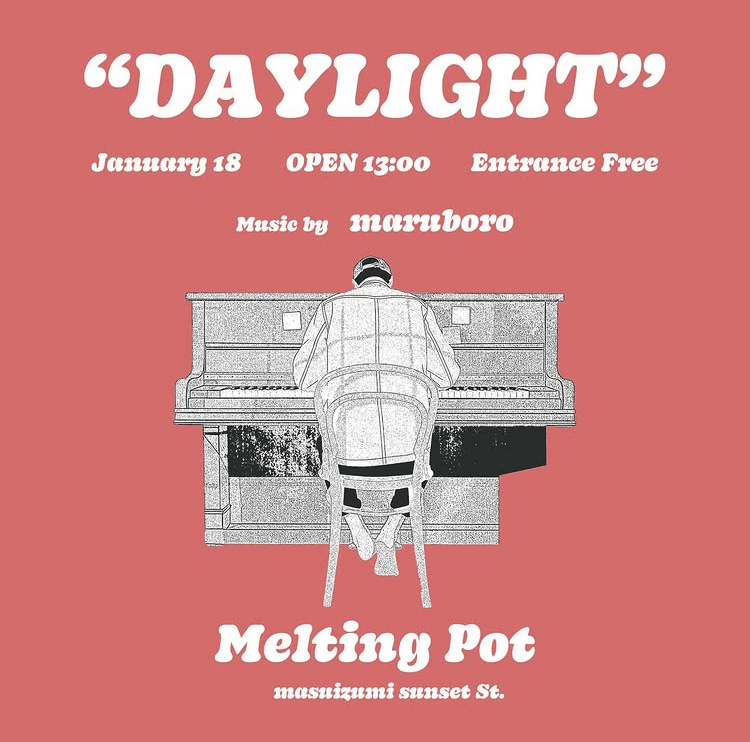 DAYLIGHT PARTY INFO Kanazawa Bar Night Party Day Party DAYLIGHT DAY:2026.01.18 Sun. OPEN:13:00 ENTRANCE:FREE VENUE:Meltingpot ■MUSIC maruboro