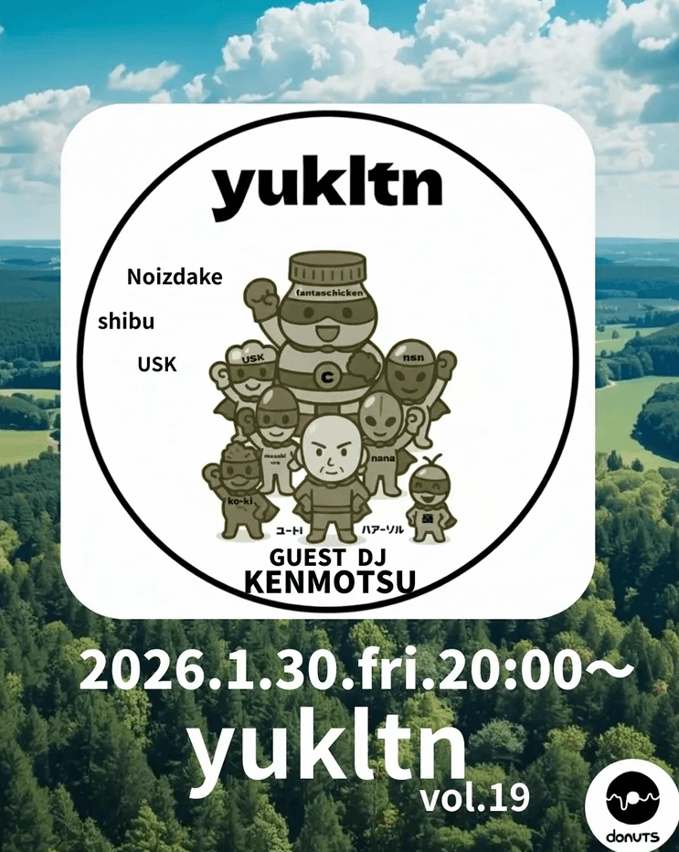 yukltn vol.19 PARTY INFO Kanazawa Bar Night Party yukltn vol.19 DAY:2026.01.30 Fri. OPEN:20:00 VENUE:music bar donuts ■GUEST DJ KENMOTU ■演者 NOIZDAKE USK SHIBU