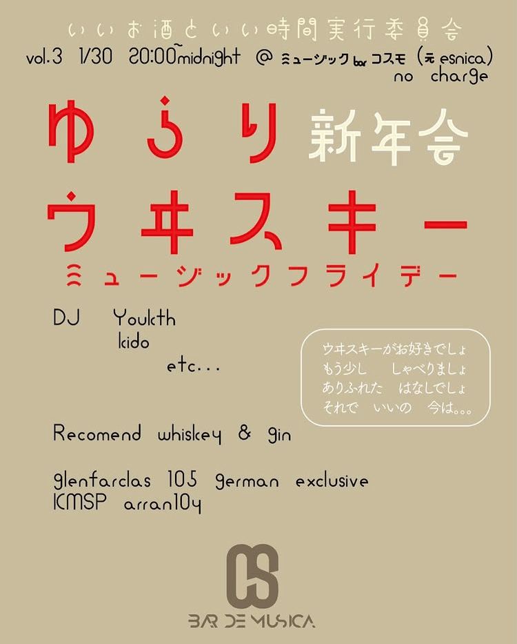 ゆらりウヰスキー ミュージックフライデー PARTY INFO Kanazawa Bar Night Party ゆらりウヰスキー ミュージックフライデー DAY:2026.01.30 Fri. OPEN:20:00 CHARGE:FREE VENUE:ミュージック bar コスモ(元esnica) ■DJ Youkth Icido