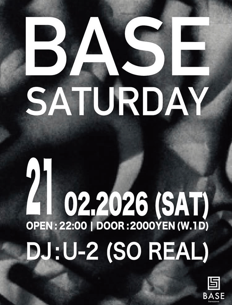BASE SATURDAY PARTY INFO Kanazawa Club Night Party BASE SATURDAY DAY:2026.02.21 Sat. OPEN:22:00 DOOR:2,000JPY(W1D) VENUE:BASE ■DJ U-2(SO REAL)