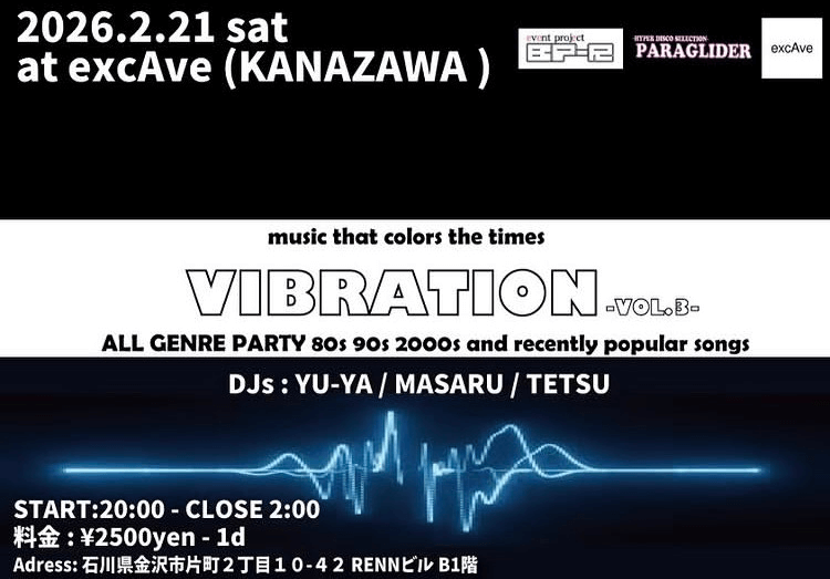 VIBRATION PARTY INFO Kanazawa Club Night Party VIBRATION DAY:2026.02.21 Sat. START:20:00 CLOSE:02:00 ENTRANCE:2,500JPY 1D VENUE:excAve ■DJ YU-YA MASARU TETSU