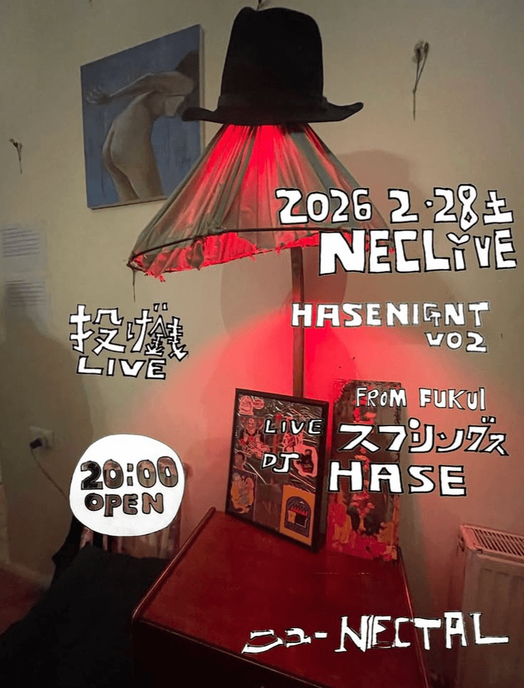 NECLiVE PARTY INFO Kanazawa Bar Night Party NECLiVE HASENIGHT VO2 DAY:2026.02.28 Sat. OPEN:20:00 VENUE:ニューNECTAL ■LIVE スプリングス ■DJ HASE