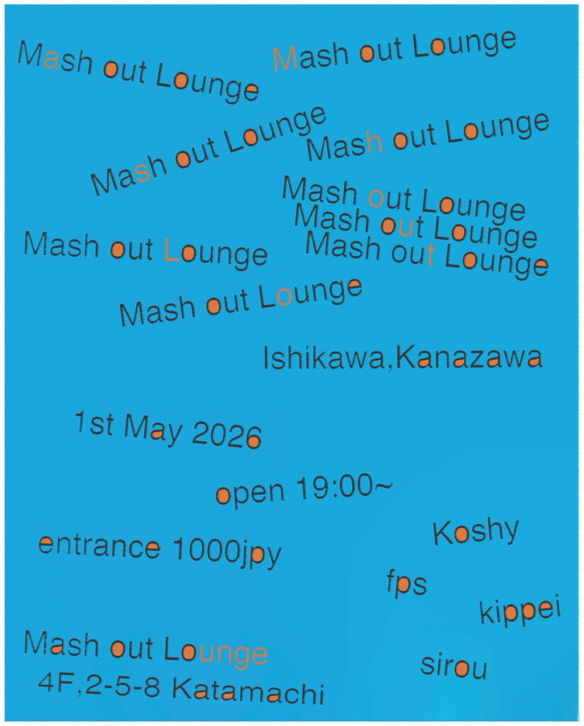 Mashout Lounge PARTY INFO Kanazawa Bar Night Party Mashout Lounge DAY:2026.05.01 Fri. OPEN:19:00 ENTRANCE:1,000JPY VENUE:Music Bar Mashout ■DJ fps Kippei Koshy Sirou
