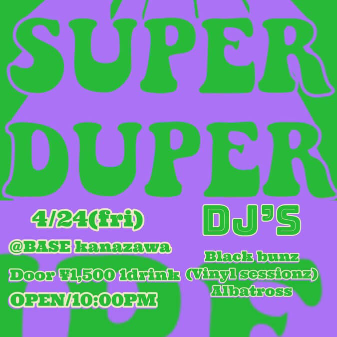 SUPER DUPER PARTY INFO Kanazawa Club Night Party SUPER DUPER DAY:2026.04.24 Fri. OPEN:22:00 DOOR:1,500JPY 1D VENUE:BASE ■DJ Black bunz(Vinyl sessionz) Albatross